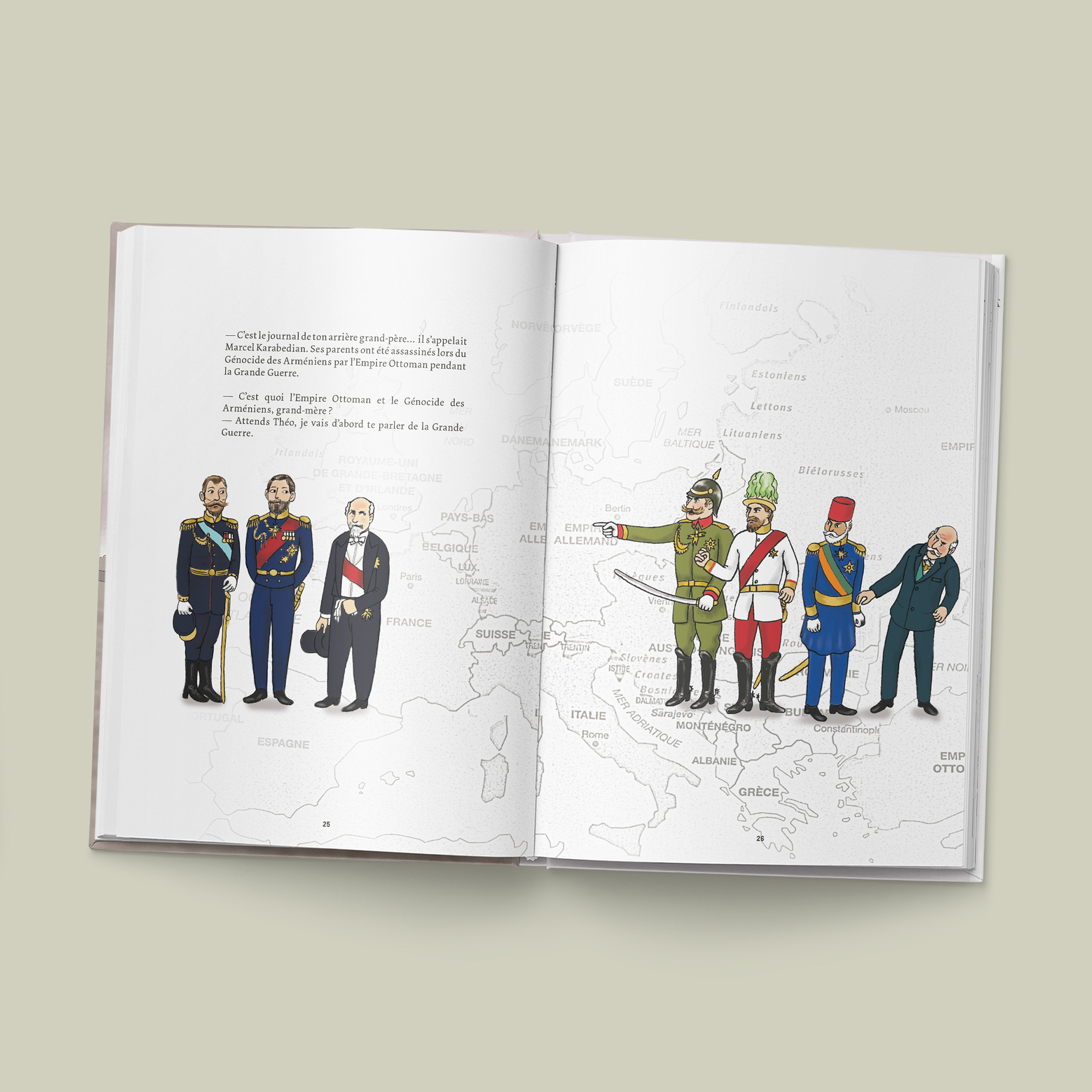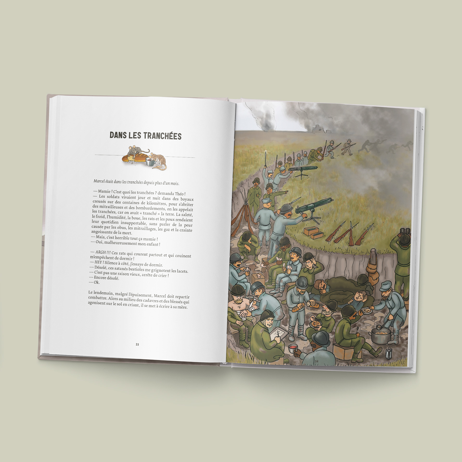 Graphisme et mise en page d'un livre réalisé pour la commémoration du Centenaire de la Première Guerre mondiale, écrit par deux collégienne et illustré par Aude Meeschaert.